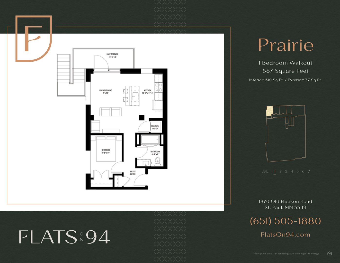 Boasting 687 square feet of refined space, Prairie offers a harmonious blend of comfort and sophistication. Bask in the abundance of natural light with 12-foot ceilings, while the walkout terrace invites you to savor breathtaking views. Embrace culinary delights in the sleek kitchen, complete with a stylish island that becomes the heart of your home. Discover the perfect balance of luxury and convenience in Prairie – where every day feels like a dream come true.